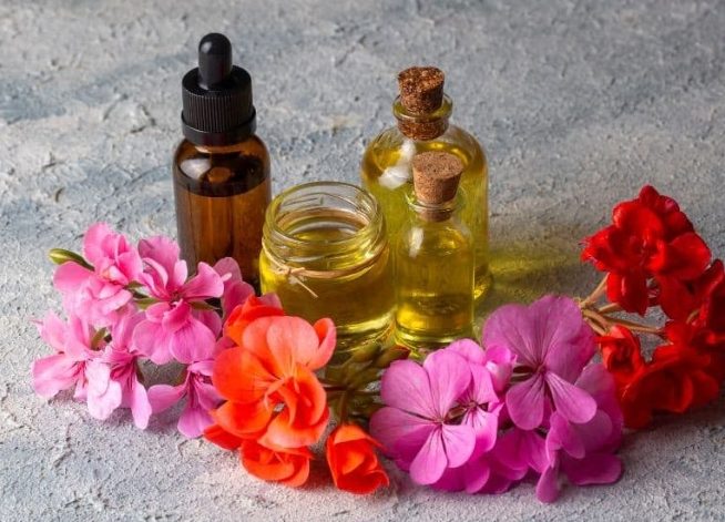 - 加入無香保養品: 在無香精的乳液、洗髮精、沐浴露中(一次的使用量),加入1滴天竺葵精油(攪拌均勻後再使用)。記得一次只調一次用量,避免整罐保養品變質。