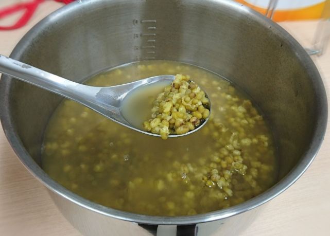 • 悶夠時間後,小心打開鍋蓋(小心蒸氣!),用湯匙撈一點綠豆出來壓壓看。如果輕易就能壓碎、呈現沙沙的狀態,或者已經破皮開花,就表示 煮透了! 恭喜!如果還是有點硬?別擔心,簡單: