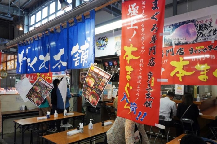 - 自己市場買料請師傅代工: 這是我最愛的方式!先去市場攤位掃貨,挑選你看中的魚、蝦、貝類(記得問老闆是否適合生食),買好後拿到食堂櫃台,跟師傅說你想怎麼吃(生魚片/Sashimi?鹽烤/Shioyaki?天婦羅/Tempura?煮湯?都可以商量!),師傅會酌收一點處理費(通常幾百日圓),幫你處理好端上桌。 那種自己挑的魚變成眼前美食的過程,成就感滿滿!