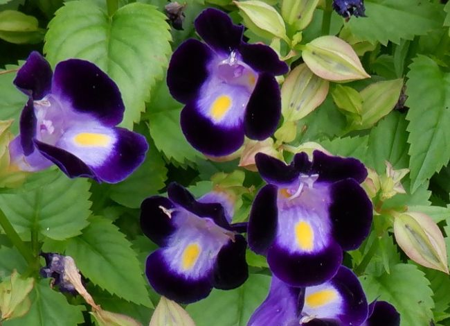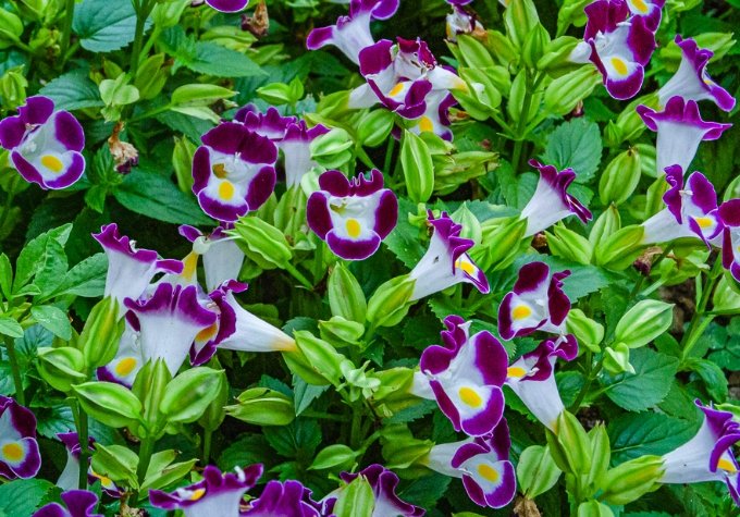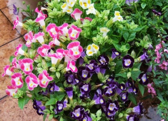 • 蔓性夏堇 (Torenia hybrids): 這幾年比較流行起來的品種,枝條比較細軟,會往下垂或者蔓延生長。非常非常適合吊盆!讓它從盆緣瀑布般傾瀉而下,開滿星星點點的小花,美極了。花色也很多變。我覺得它是把夏堇應用場景擴大的功臣。