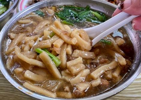 - 介紹: 台中特有的「大麵羹」,沒吃過等於沒來過台中傳統市場!這家老牌的口味很道地。粗粗的黃麵條(就是「大麵」)煮到軟而不爛,帶著一點點獨特的鹼香(有些人吃不慣,但我覺得這就是特色)。湯頭看起來清澈,其實充滿了油蔥、蝦米、韭菜的香氣,很樸實的古早味。記得一定要加桌上的特製辣菜脯(免費!),鹹香辣提味,整個層次就上來了!是我心中新建國市場大麵羹的代表之一。