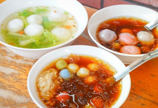 - 甜湯圓: 包芝麻或花生內餡,煮在紅豆湯、花生湯或桂圓湯裡,料多實在,甜而不膩。