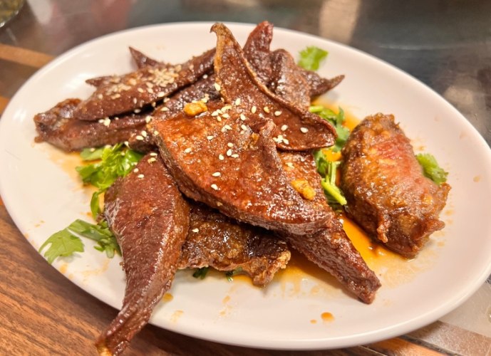 • 四季肥腸:肥腸先滷再炸,外皮酥脆像餅乾,裡面軟糯,搭配蔥蒜辣椒爆炒,香氣四溢。