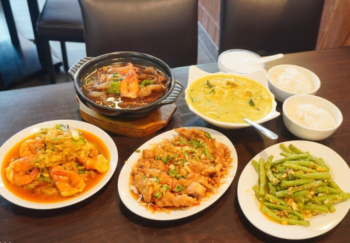 • 泰式椒麻雞:雞腿排炸得酥脆,淋上自調的泰式酸辣醬汁,酸、辣、香兼具,非常過癮。