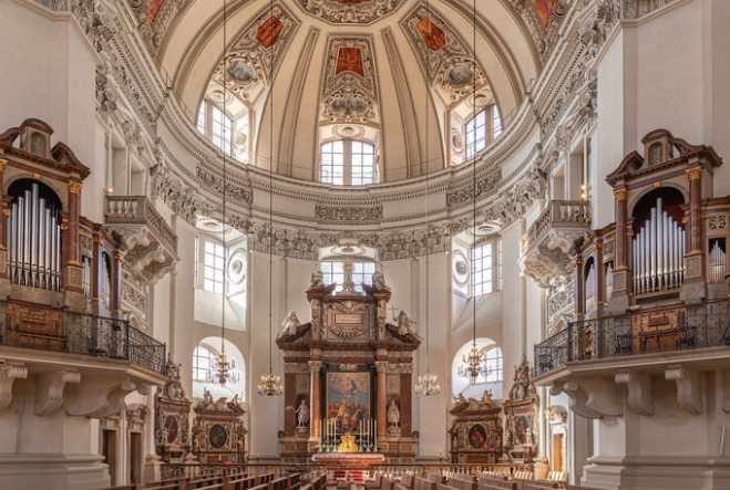 - 介紹: 薩爾斯堡老城的心臟地標,壯麗的巴洛克風格建築。巨大的青銅大門、華麗的內部裝飾、精美的濕壁畫和管風琴都值得細看。莫扎特曾在這裡受洗並擔任過宮廷管風琴師。教堂廣場(Domplatz)也是舉辦市集和活動的重要場所。