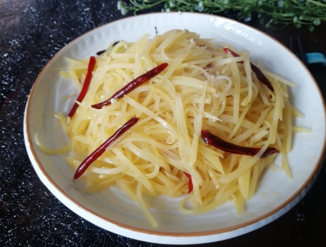 - 馬上出鍋!拒絕悶煮! 迅速將整鍋 炒土豆絲 盛入預熱過的盤子裡(瓷盤先溫一下,菜不容易涼)。動作要快!土豆絲在鍋裡多待一秒,餘熱都可能讓它過熟變軟。熱騰騰地上桌,那股混合著蒜香、醋香、鑊氣的香氣,讓人食指大動!