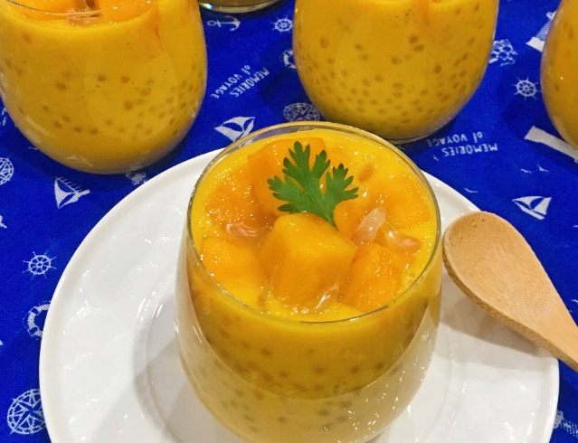 - 拿出冰涼的椰奶基底、芒果泥、瀝乾水的西米、 柚子肉和預留的芒果丁。