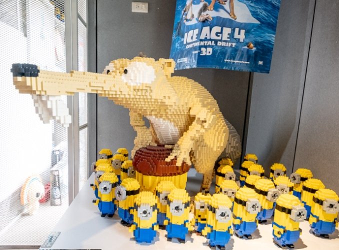- 巨型創意積木雕塑區: 這一區充滿驚喜和幽默感! 超巨大的黃色小鴨 萌翻天,還有 各種擬真度超高的動物(長頸鹿、大象、獅子),甚至 生活化的場景(如摩托車、鋼琴)。最讓我印象深刻的是用透明藍色積木拼成的 巨型海浪,陽光透過積木灑下來的感覺很夢幻。這裡是 拍照打卡的熱點,隨便拍都很有戲劇效果。不過部分大型作品會圍起來,無法觸控或靠太近,稍微有點可惜。