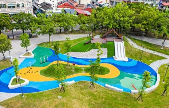 A: 非常適合! 中央七彩噴泉、寬闊安全的步行空間(中山路徒步區)、鄰近的嘉義市立博物館(有互動設施)、檜意森活村(日式建築環境友善)、北門車庫園區(火車頭)都很吸引小朋友。晚上看噴泉他們通常會很興奮。