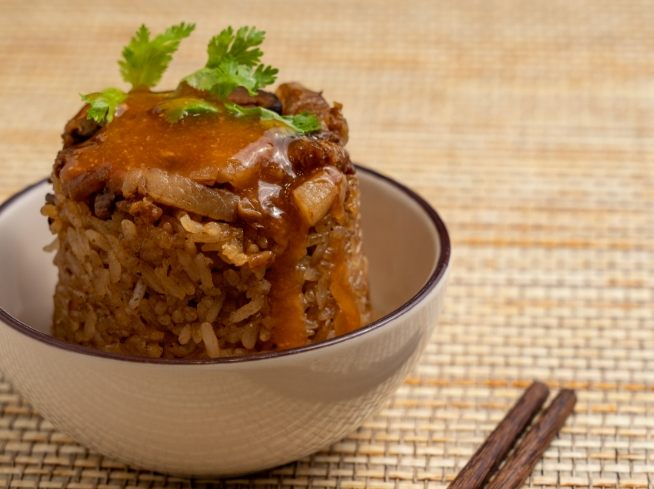 這家藏身在 水仙宮市場 裡頭,沒掛大招牌,但老饕都知道。它的米糕屬於「筒仔米糕」,用小小的陶缽蒸出來。糯米蒸得恰到好處,粒粒分明又帶點黏性。上面鋪的肉燥是靈魂,肥瘦比例抓得很好,鹹香中帶點微甜,滷汁完全滲透到米飯裡。加上魚鬆、小黃瓜片,簡單經典。淋上特製甜辣醬更提味。缺點就是份量不大,男生可能要嗑兩碗才過癮。