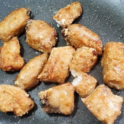 - 油熱後,把切片的魚卵卷放下去,中小火慢煎。千萬別大火急攻!