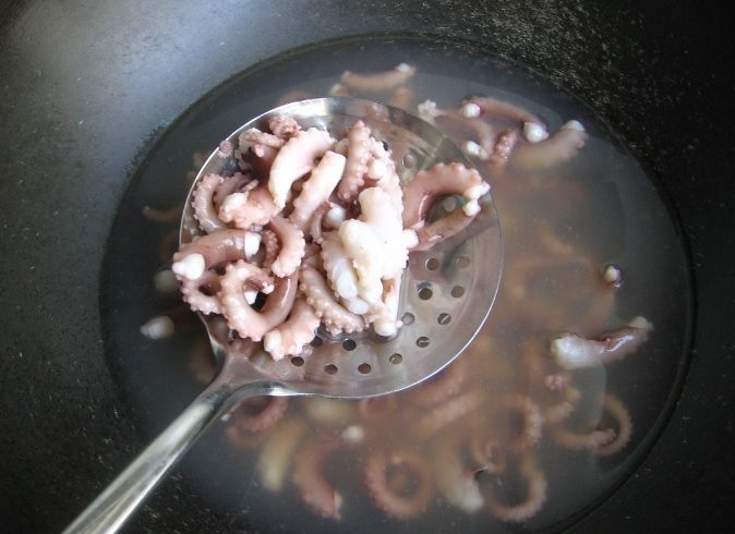 - 下鍋三提三放: 抓住章魚頭(身體),把觸手末端浸入滾水3秒,提起;再浸入3秒,提起;重複第三次後,整隻放入。
