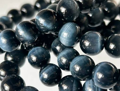 - 藍虎眼石:就是大家熟知的「鷹眼石」。顏色是深邃的灰藍色,光帶通常是銀藍色。這種給人一種冷靜、清晰的感覺,跟溝通、表達力連結很深。我自己壓力大或需要集中精神寫東西時,特別喜歡戴著藍虎眼的手串。