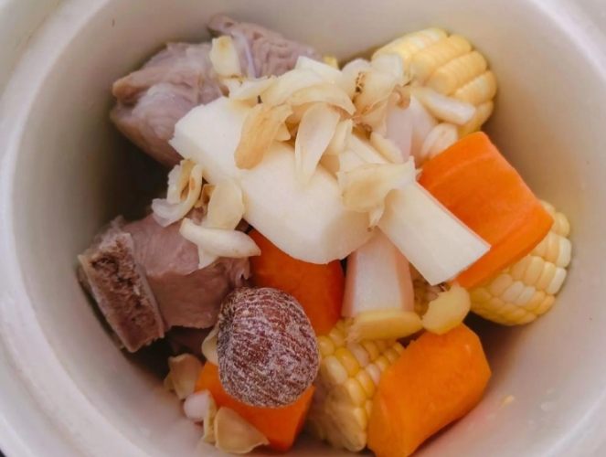 - 加水煮滾: 放入紅蘿蔔塊、玉米段(連芯)、栗子。加入足量的冷水(蓋過所有材料再多一點點,因為之後不太加水)。冷水下料才能慢慢釋放甜味。