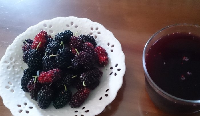 • 染色性超強! 桑椹汁顏色濃鬱,沾到衣服幾乎洗不掉!處理桑椹或倒汁時千萬小心,最好穿上圍裙。牙齒也可能暫時染色,喝完漱口或喝水就好。
