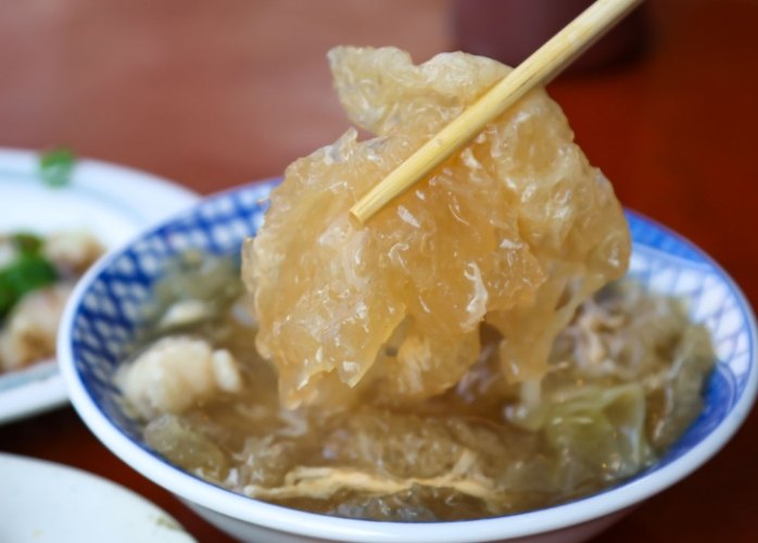 這道菜的食材真的很特別,我第一次聽到也滿臉問號!"假魚肚"其實是用豬皮曬乾油炸後製成的食材,因為泡發後呈現如魚肚般的蜂巢狀而得名(素食也有用其他食材仿製的)。北港有些老小吃店會把它做成羹湯。處理得好的假魚肚,完全沒有油膩感,吸飽了湯汁後,口感軟中帶Q,有點像更厚實的炸豬皮(膨皮),但更清爽。羹湯通常口味較清淡,搭配筍絲、香菇絲等熬煮,喝起來很舒服。是一種獨特的地方小吃體驗,好奇寶寶必嘗!
