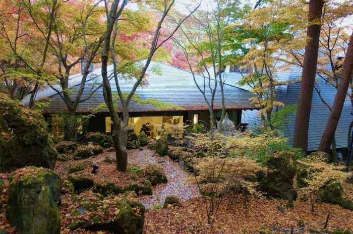 - 庭園漫步:美術館不是封閉的盒子!它依山傍湖(雖然離湖邊有點距離,但視野超棒),精心設計了迴游式庭園。參觀路線引導你穿梭在各個展廳之間,步移景異。庭園裡有小橋流水(是真的小溪!)、蒼勁古松、精心佈置的苔蘚和石頭。漫步其中,耳邊是潺潺水聲和鳥鳴,空氣中是草木清香,眼前是震撼的藝術瑰寶。這份藝術、建築、自然三者渾然一體的體驗,簡直治癒力滿分!走累了,在面向庭園的長凳上坐一會兒,看著光影在綠意中跳舞,比喝十杯咖啡都提神。整個 久保田一竹美術館 的環境營造,讓你感覺不是在參觀,而是在進行一場淨化心靈的儀式。