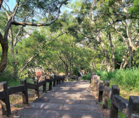 - 起點 (土地公廟): 停好車後,你會看到一個小小的土地公廟(福龍宮),旁邊有導覽圖和解說牌。重要! 這是環狀步道的起點,也是終點。從這裡出發,建議選擇「逆時針」方向走(也就是面對導覽圖,往左邊階梯上去的路)。為什麼?因為這樣一開始是連續的上坡階梯,趁體力好時先爬完,後面比較輕鬆,而且最後的觀景臺是下坡抵達,可以好好休息。如果順時針走,最後那段上坡階梯會比較累人(親身體驗過...下山膝蓋在哀號)。