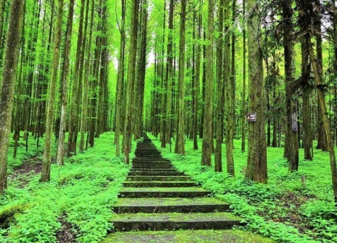 - 路線:登山口 → 一路沿著寬敞主步道緩緩上行 → 經過蔥鬱樹林、夢幻柳杉林、聆聽溪澗聲 → 抵達 最高點觀景平台(這裡一定要停下來看風景、拍照!)→ 平台旁有岔路, 選擇往下的階梯(通常會有指標往「出口」或「停車場」方向)→ 這條下坡路會帶你穿過另一片林相 → 最終會接回靠近停車場/公車站的地方(出口離入口很近)。