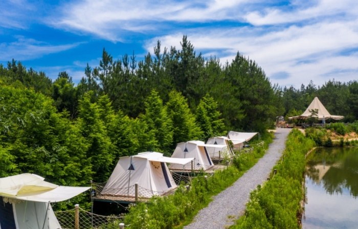 這個營區就在知名的小瑞士花園旁邊,隸屬於統一渡假村管理。它跟青青草原是截然不同的風格。這裡規劃得很整齊,像棋盤格一樣,每個營位大小都差不多,地上鋪了碎石或木棧板,很乾淨俐落。如果你是屬於那種喜歡「整齊劃一」、「乾乾淨淨」的露友,這裡會很舒服。四周種了不少樹木,夏天遮蔭效果不錯,空氣也很好。晚上走去旁邊的小瑞士花園看水舞秀(需另購門票)很方便,有種住在景區VIP區的感覺,適合喜歡便利和整潔度的人。不過,對於喜歡原始草地營位、追求開闊山景的人來說,這裡的視野就比較侷限一點,被樹和建築遮擋了不少。