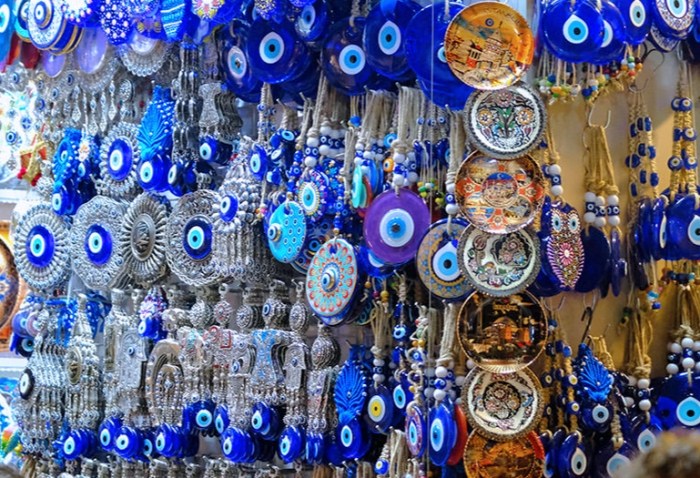 邪惡之眼飾品 (Nazar Boncuğu) 土耳其文化象徵,驅邪避兇保平安,造型多樣 (手鍊、項鍊、吊飾)。 玻璃製的較傳統有質感,塑膠的便宜但質感差。大小、顏色、設計變化多,送男送女都適合。我習慣每次去都幫自己和家人帶新的。 小吊飾:15-50