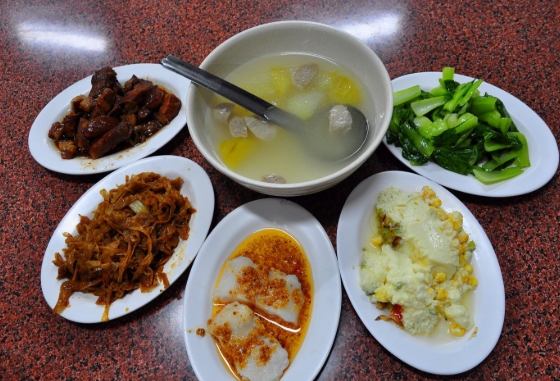 - 型別: 自助式中餐,採秤重計價($100/100g)。菜色就是家常菜:炒青菜、滷肉、香腸、紅燒豆腐、蒸蛋、湯品等。