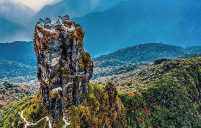 - 特色: 這是 梵淨山 最讓人驚心動魄的地方!一座獨立突兀的石峰拔地而起,峰頂一分為二,由一座石橋相連,兩邊各有一座小廟(釋迦殿和彌勒殿)。雲霧繚繞時,如同漂浮在空中的仙山瓊閣。彌勒道場的核心所在。