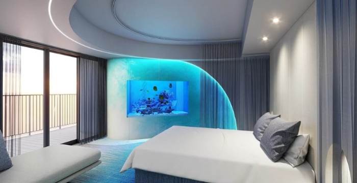 特色房型: 「Aqua Room」水族館景觀房 是最大賣點!躺在床上就能欣賞水槽裡的魚群遊過,晚上還有特別燈光秀(只限房客),體驗獨一無二。不過這種房型數量少、價格非常高!其他房型就是標準的樂園飯店房間(部分有海景),就沒那麼特別了。