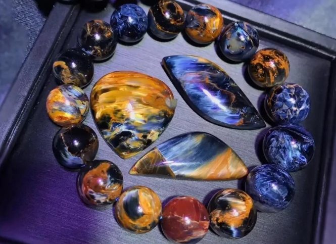 - 真彼得石: 它的魅力就在於那獨一無二、渾然天成的紋理!藍線石(鷹眼)和虎眼石的纖維絲交織纏繞,形成動態十足的 漩渦狀、纖維狀、條帶狀、雲團狀 混合體。這些紋理過渡應該是 自然流暢、深淺變化豐富、有層次感的。顏色通常以 藍、金、棕褐、紅褐 交織為主,分佈不均且隨機。仔細在某個角度轉動,能看到類似鷹眼或虎眼的 絲絹光澤(貓眼效應),但這種光澤在彼得石上是 斷續的、破碎的、不規則的,因為纖維結構被打亂了!這點很關鍵!