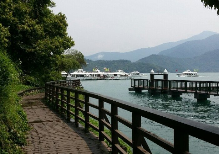 步道主要由平整的石板木棧道構成,起伏非常平緩(幾乎感覺不到坡度),走起來超級舒服。沿途濃密的樹蔭是盛夏的救星,即使是中午時分也不太會曝曬到受不了(當然防曬還是要做)。我最愛的是它那多變的視角:一下子是開闊無敵的湖景,一下子又鑽進綠意盎然的林間,轉個彎,經典的「拉魯島(光華島)」搭配著遠方的層疊山巒就映入眼簾,簡直像在看一幅會動的水墨畫。