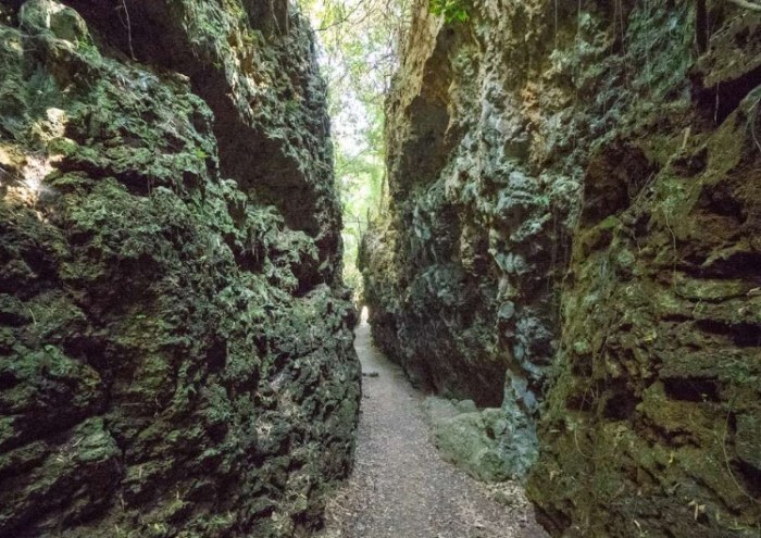 2. 石灰岩洞窟探索區: 從生態園區再往上走(跟著「三角點」或「好漢坡」指標),會進入更原始的石灰岩林區。這裡散佈著大小不一的天然洞穴,像「瘦身洞」(真的要側身過,很有趣)、「減肥洞」(比較寬敞)、「一簾幽夢」(垂掛的樹根像簾幕)等等。穿梭在這些奇巖怪石間,真的像在探險!提醒:部分洞穴較深暗,建議帶手電筒;步道原始濕滑,穿防滑鞋很重要! 這裡的生態也更原始,觀察植物和各種附生蘭花是一大樂趣。我探頭看了幾個洞,涼風陣陣,夏天來一定超舒服。