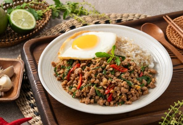 • 「泰式打拋豬肉飯」:口味夠勁(可調辣度),很下飯。