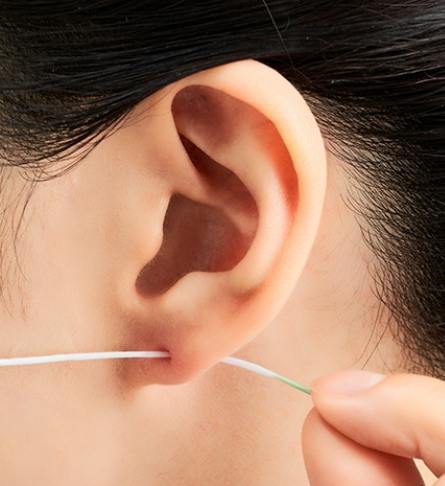 • 線順利穿出來後,捏住線的兩端,輕輕地來回拉動幾下(動作要超輕!),讓線上的液體和摩擦力帶走耳洞通道內的髒汙和老廢角質。