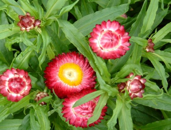 - 花: 真正的小花藏在中間,像個小鈕釦。我們看到的五彩繽紛的「花瓣」,其實是苞片!這些苞片摸起來硬硬的、乾乾的,像塗了一層蠟(所以叫蠟菊嘛)。就是這層蠟質,讓它在乾燥後還能保持顏色和形狀。顏色飽和度高到不行,大紅、亮黃、深紫,在陽光下簡直會發光!形狀像小菊花,但質感完全不同。我覺得它有種「塑膠花」的錯覺美,但人家可是真真實實從土裡長出來的生命!開花期超長,從春末一直開到秋涼,不斷有花苞冒出來。