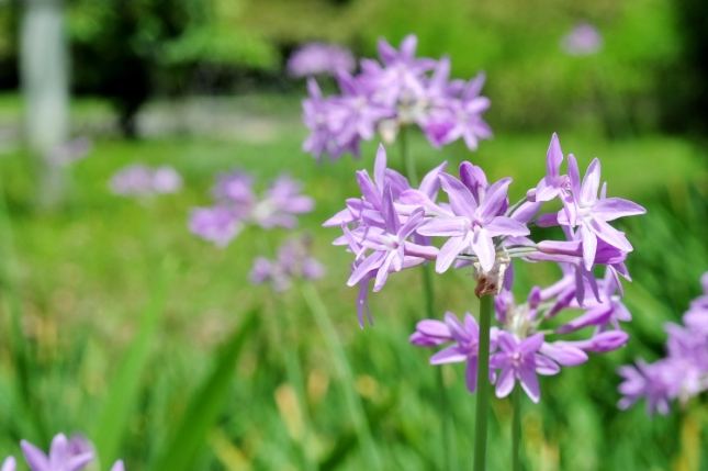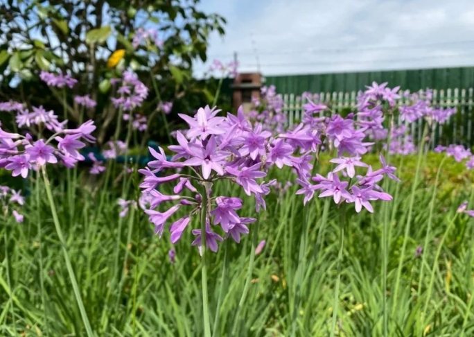 • 常見款紫嬌花 (Tulbaghia violacea 'Silver Lace'): 這是最、最、最普遍看到的。葉子細長,邊緣帶點白邊(所以叫銀邊?),開那種標準的粉紫色小花球。超級好養,基本款首選。