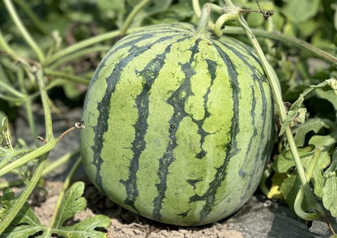 - 看果皮光澤: 成熟的西瓜,果皮上的蠟粉(霧霧的感覺)會退掉,顯露出品種本身的光澤感(不是油亮),而且顏色看起來比較「熟」,條紋更清晰。