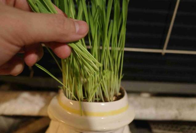 我都剪一小撮直接餵主子,新鮮度💯!牠超愛。 試過剪一把放碗裡,結果牠興趣缺缺... 還是現剪現吃最對味! |