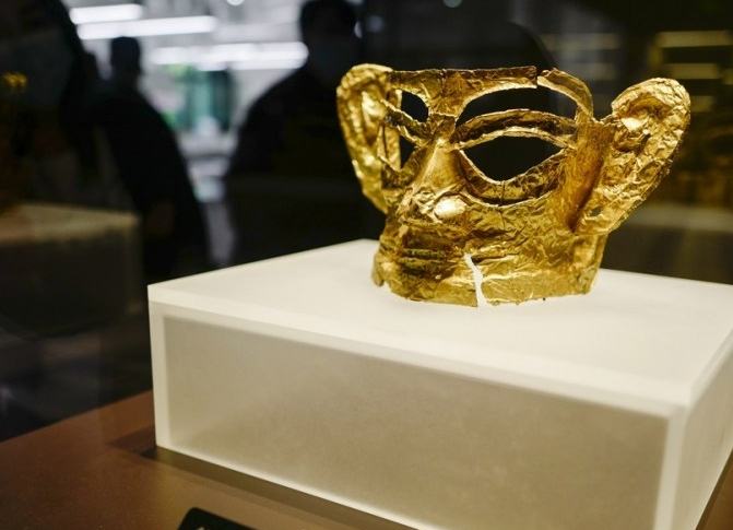 - 黃金面具與金杖:三星堆的「土豪金」閃瞎眼!那個殘重仍達280克的黃金面具(原本貼附在青銅人像上),顯示了難以想像的尊貴地位。還有刻著魚鳥箭矢紋路的金杖,是至高王權與神權的象徵吧?黃金的質感,歷經幾千年還是那麼耀眼。位置:新館二樓獨立展櫃。