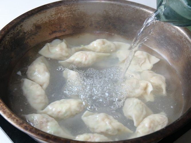 - 水滾下餃子後,馬上蓋上鍋蓋,用中大火煮滾。這能迅速讓水溫回升。