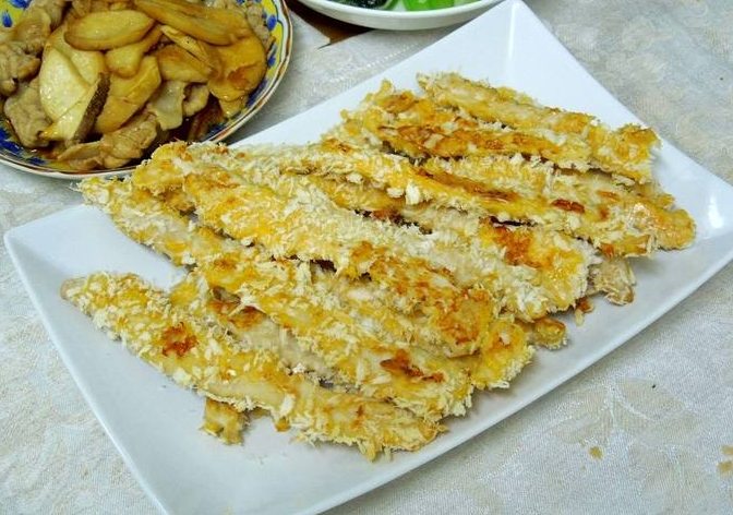 - 裹粉: 時間到,再次用廚房紙巾輕輕按壓掉魚柳表面可能滲出的水份。將樹薯粉/地瓜粉放在淺盤中,把魚柳兩面都均勻地、薄薄地沾上一層粉,然後拿起來輕輕抖掉多餘的粉。粉千萬別裹太厚,薄薄一層就行,目的是吸掉表面殘餘水分和幫助形成脆殼。