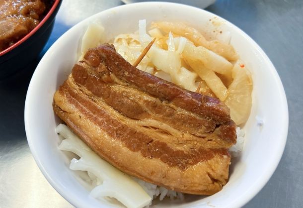 - 點爌肉飯(可選肥瘦或部位喜好告訴老闆)。配菜必點滷豆腐和筍乾。湯品推薦金針湯(埔里特產)或排骨酥湯。店內免費的醃蘿蔔乾記得拿一點點,清爽解膩。