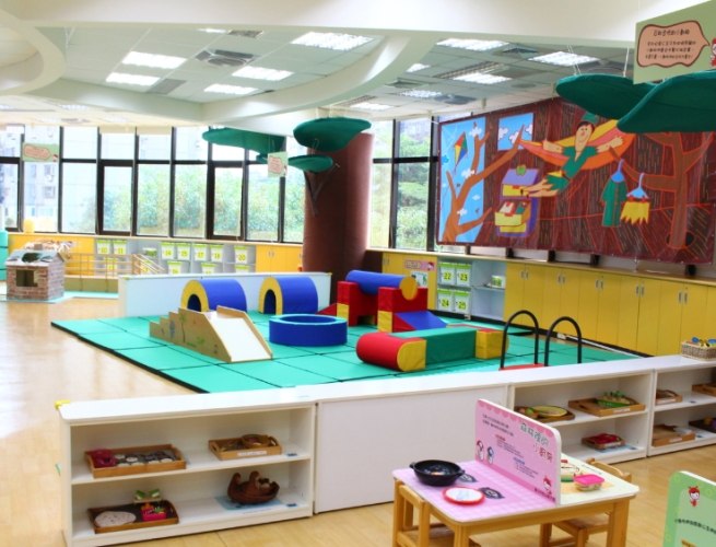 - 用矮柵欄圍起來一塊專屬 0-2歲寶寶 的區域。地板鋪滿軟墊,有軟積木、觸覺牆、小搖搖椅、布書、適合小寶寶爬行的設施。