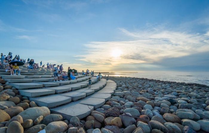 - 魚鱗天梯(網美聖地): 這幾乎是南寮漁港的代名詞了!純白色的階梯一層層延伸向大海,搭配藍天或夕陽,隨便拍都像明信片。超熱門,尤其傍晚時分人潮洶湧(想拍空景?請早!或挑非假日)。找好角度,讓階梯的線條感帶出延伸效果,人物放在畫面下方三分之一處,大片就出來了!坐在階梯上吹風看海,也很療癒。 (貼心提醒:階梯沒有護欄,帶小孩務必牽緊!風大時也小心)
