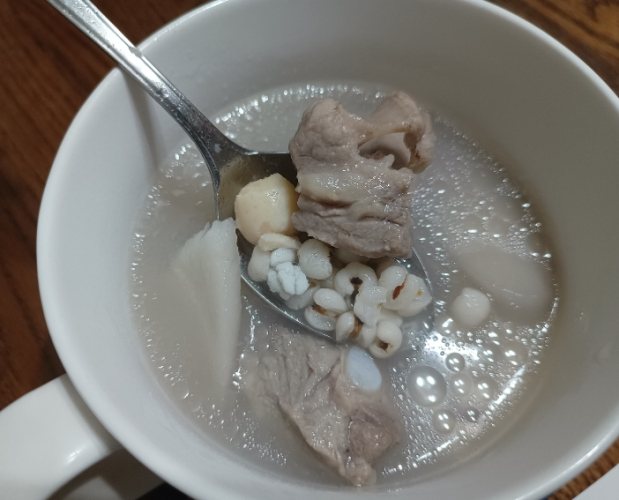 - 湯色: 清澈中帶點微微乳白的濁度(來自淮山、薏仁、芡實的澱粉質),但絕對不是混濁的。看起來就舒服。