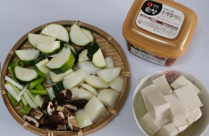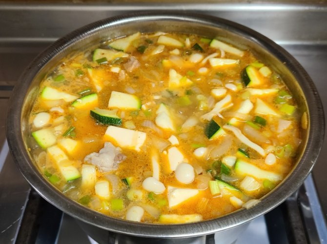 - 處理食材: 趁熬湯時,把馬鈴薯、洋蔥、櫛瓜、豆腐、青陽辣椒、金針菇、肉類或海鮮都處理好。蒜頭磨成末。這個步驟就是備料,之後下鍋才不會手忙腳亂。重點提醒:馬鈴薯塊泡水可以去掉表面澱粉,煮湯才不會糊糊的。