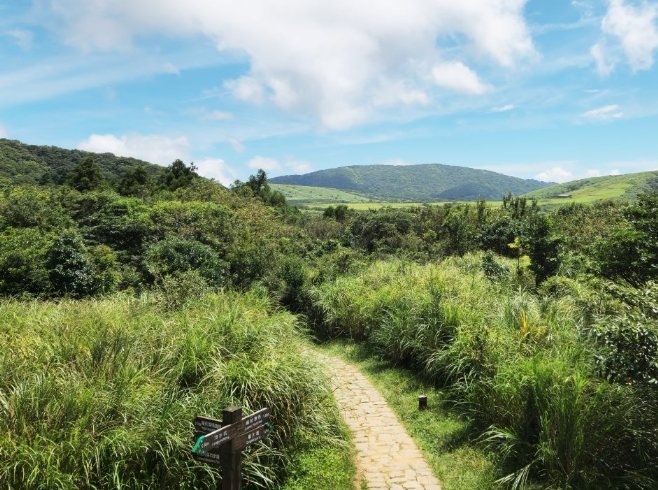 - 步道難度: 擎天崗步道的主環線,我給它打 一顆星(最輕鬆級)。整體坡度非常平緩,幾乎沒有需要拉繩或攀爬的困難地形。石板/碎石路面寬闊好走。輪椅或嬰兒車 原則上在環型步道的主要路段(靠近遊客中心那側)是可行的,但往金包裡大路方向有些碎石路或小階梯就不太適合了。這是我覺得最適合帶長輩或小孩體驗 陽明山步道 的路線之一。不過,全程幾乎無遮蔭,天氣影響是關鍵!