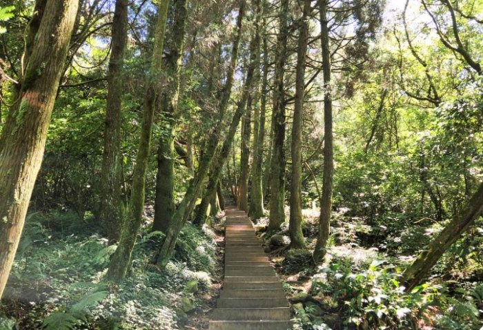 A:要非常小心! 雨後步道(特別是柳杉林間的土徑和石階)會非常濕滑泥濘,摔跤風險大增!如果你非去不可,務必穿防滑效能極佳的鞋子(登山鞋最好),強烈建議使用登山杖輔助,行走速度放慢,每一步都踩穩。如果雨勢很大或颱風剛過,建議延後幾天,等地乾一點再走比較安全舒適。安全第一!林間的青苔石階更是滑溜的隱形殺手。