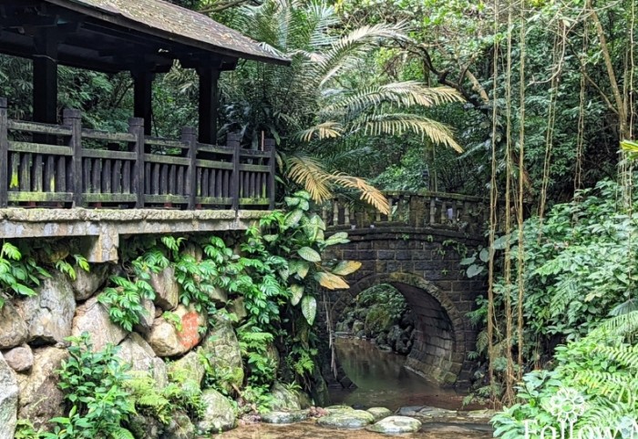 沿著虎山溪走,溪水超級清澈(我都看到小魚了!),兩旁是人工砌出的石頭駁坎,爬滿了綠油油的植物(蕨類居多),加上茂盛的樹蔭,完全不像在台北市! 空氣濕潤清新,重點是步道寬敞平緩,超級適合帶長輩或小朋友。溪邊還設了不少涼亭和觀景台,隨時可以停下來喘口氣或拍照。