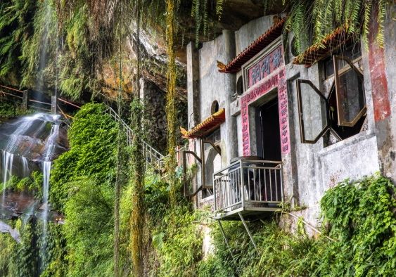 - 抵達核心:銀河洞瀑布&仙廟(拍照重點區!) - 聽到水聲,轉個彎,壯觀(或秀麗,看水量)的銀河洞瀑布和嵌在巖壁裡的廟宇就在眼前!這裡空間不大,人多時會顯得擁擠,找好角度快拍📸!廟旁有階梯可上到瀑布上方平臺(小心濕滑),感受水氣撲面。務必在此補水、稍作休息(因為接下來就要爬了!)。