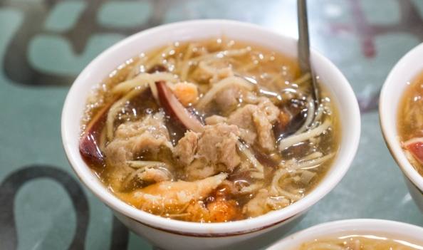 - 特色與亮點: 基隆的羹湯就是有一股獨特的魅力!這家羹湯湯頭清澈帶點微勾芡,喝起來是清爽的酸香味(來自烏醋和蒜末),非常開胃。主角魷魚給得大方,新鮮且處理得宜,口感脆彈。羹裡通常還有筍絲、香菇絲、蛋花等配料。可選擇加麵(油麵)、米粉、飯或單點羹湯。記得加點他們家的辣椒醬,更添風味。